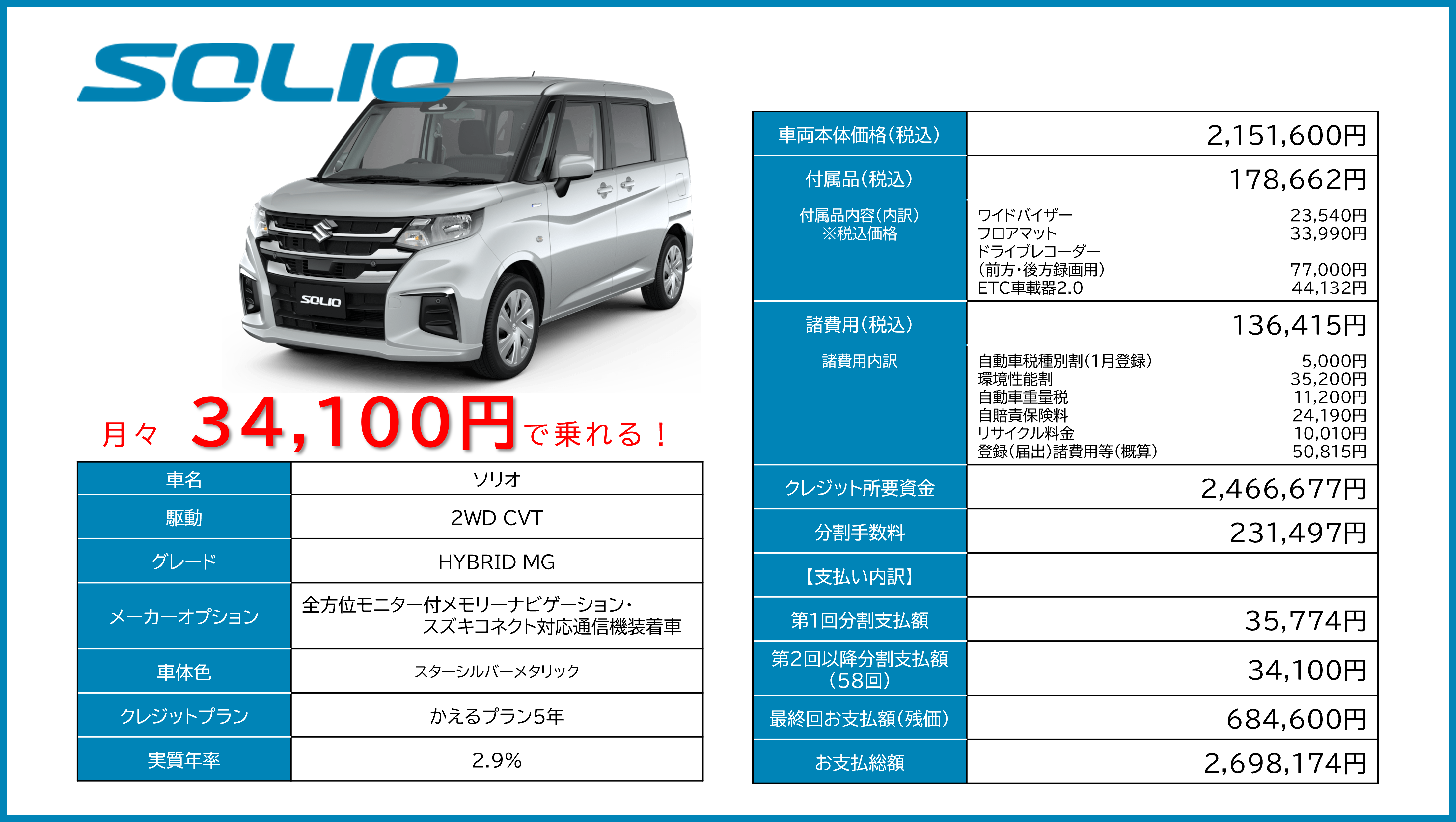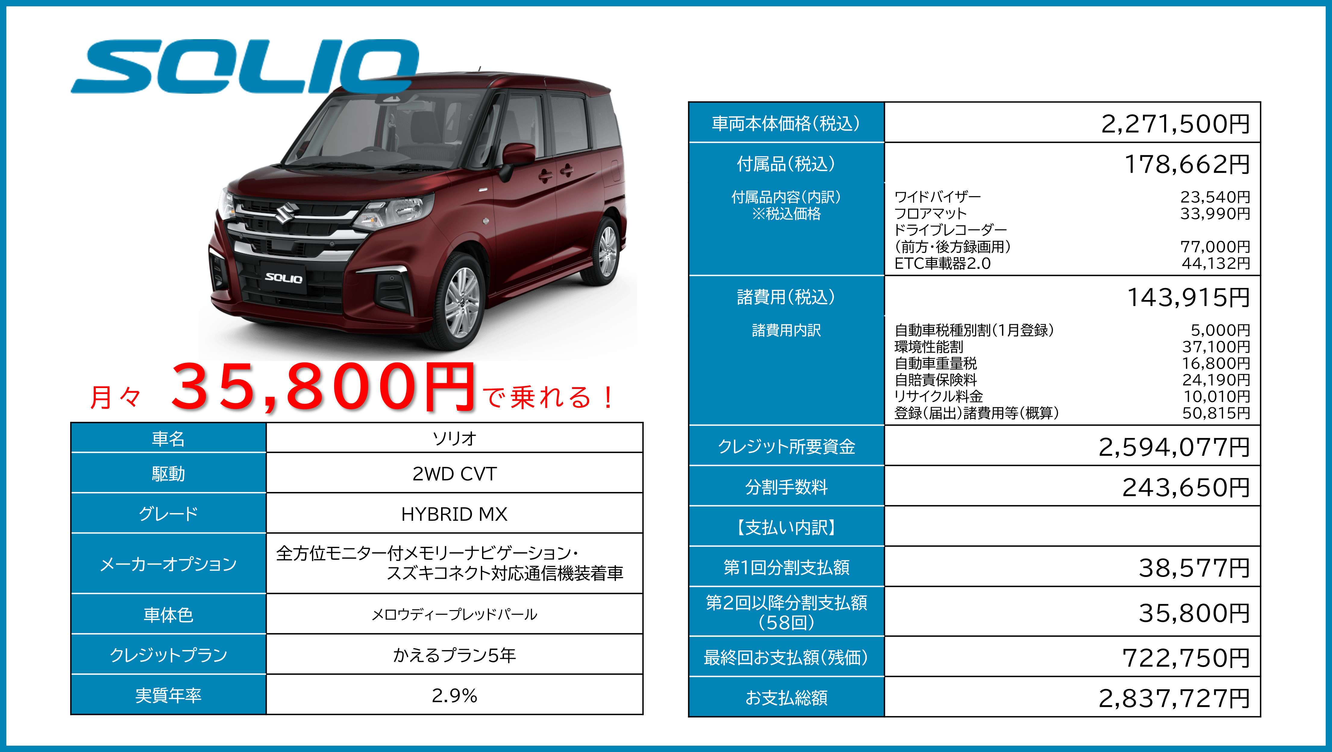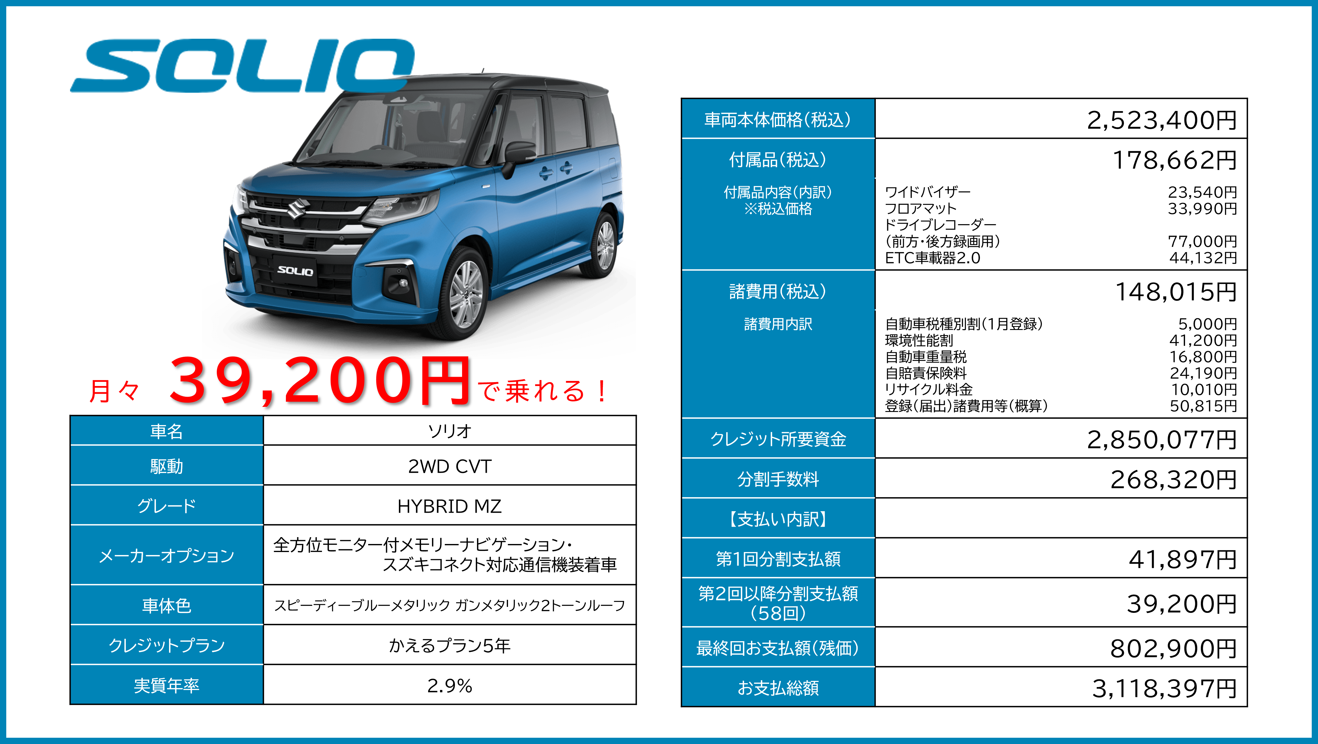 ※ 上記支払い例は参考価格です。販売会社によって金額が異なりますので詳しくはスズキ販売代理店までお問い合わせください。