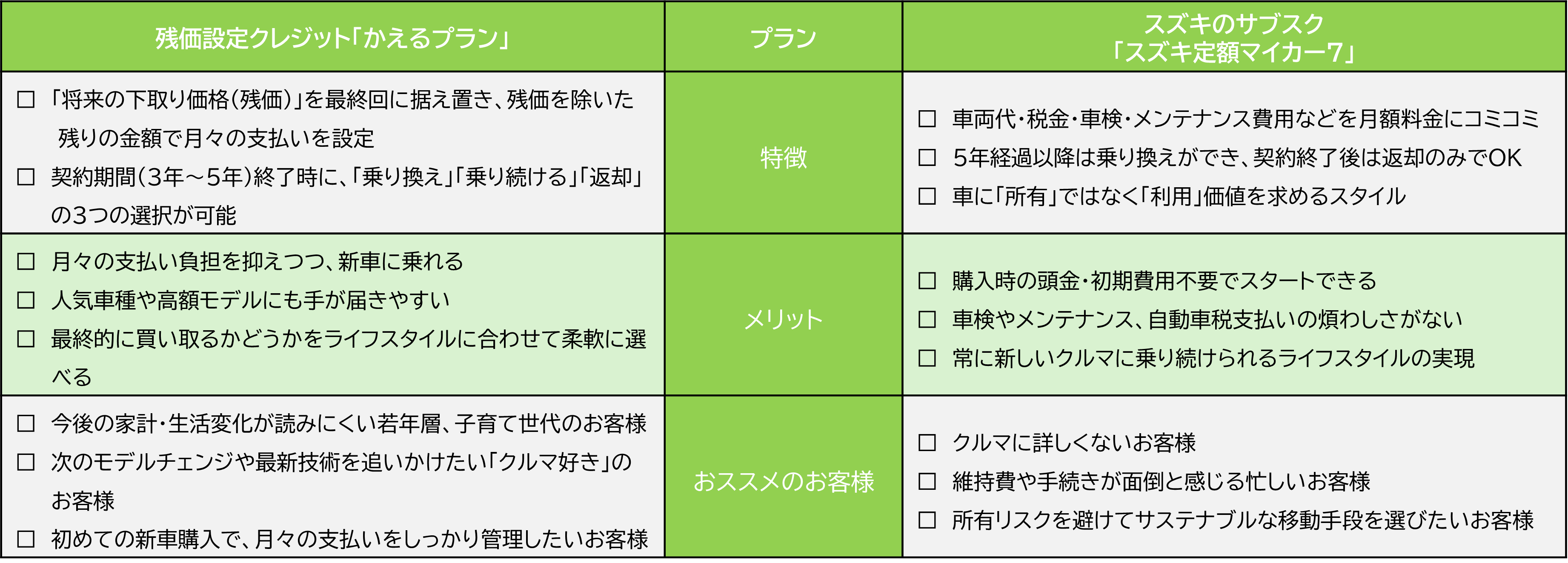 スズキでは残価設定クレジット「かえるプラン」とスズキのサブスク「スズキ定額マイカー7」をご用意しております。