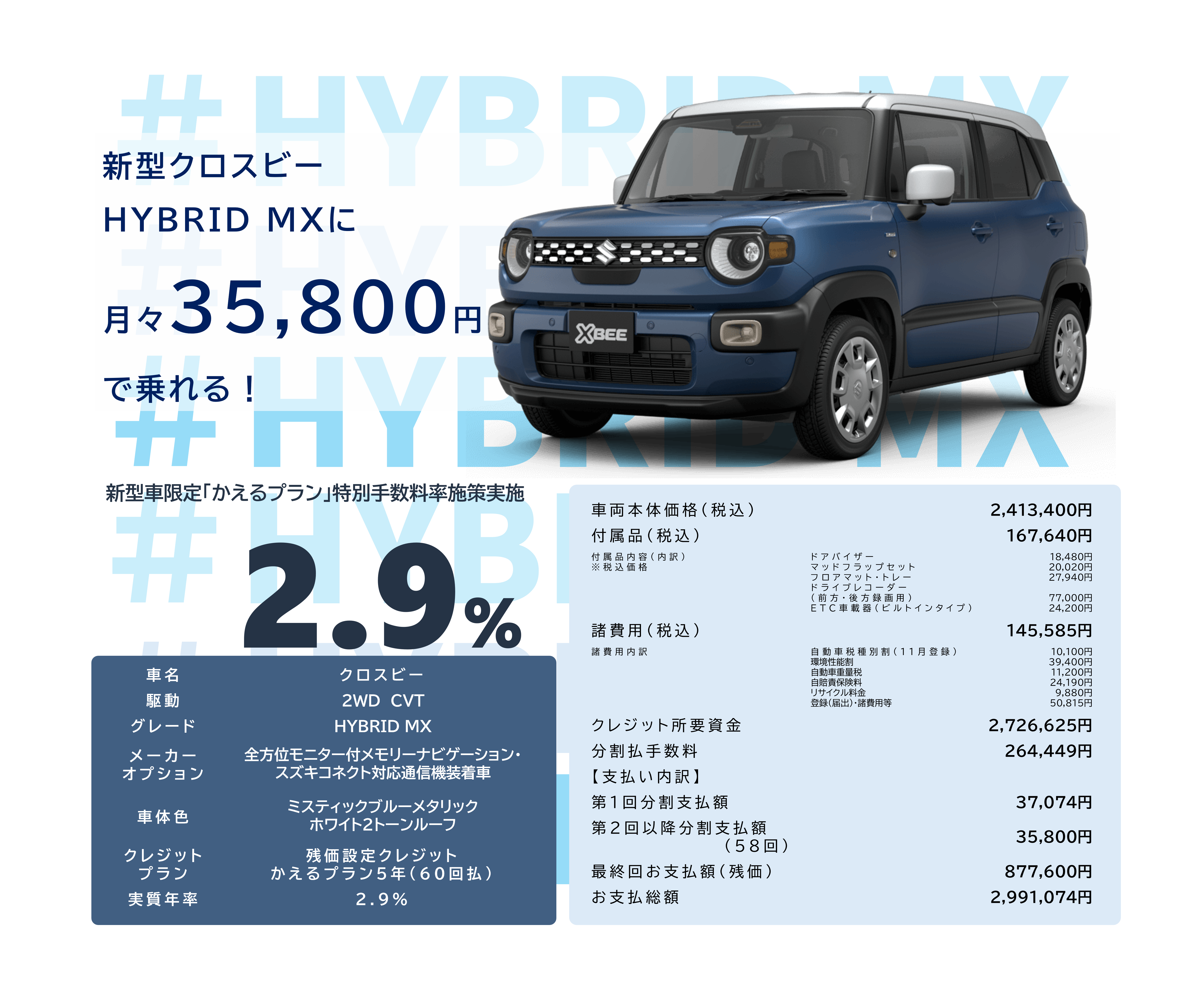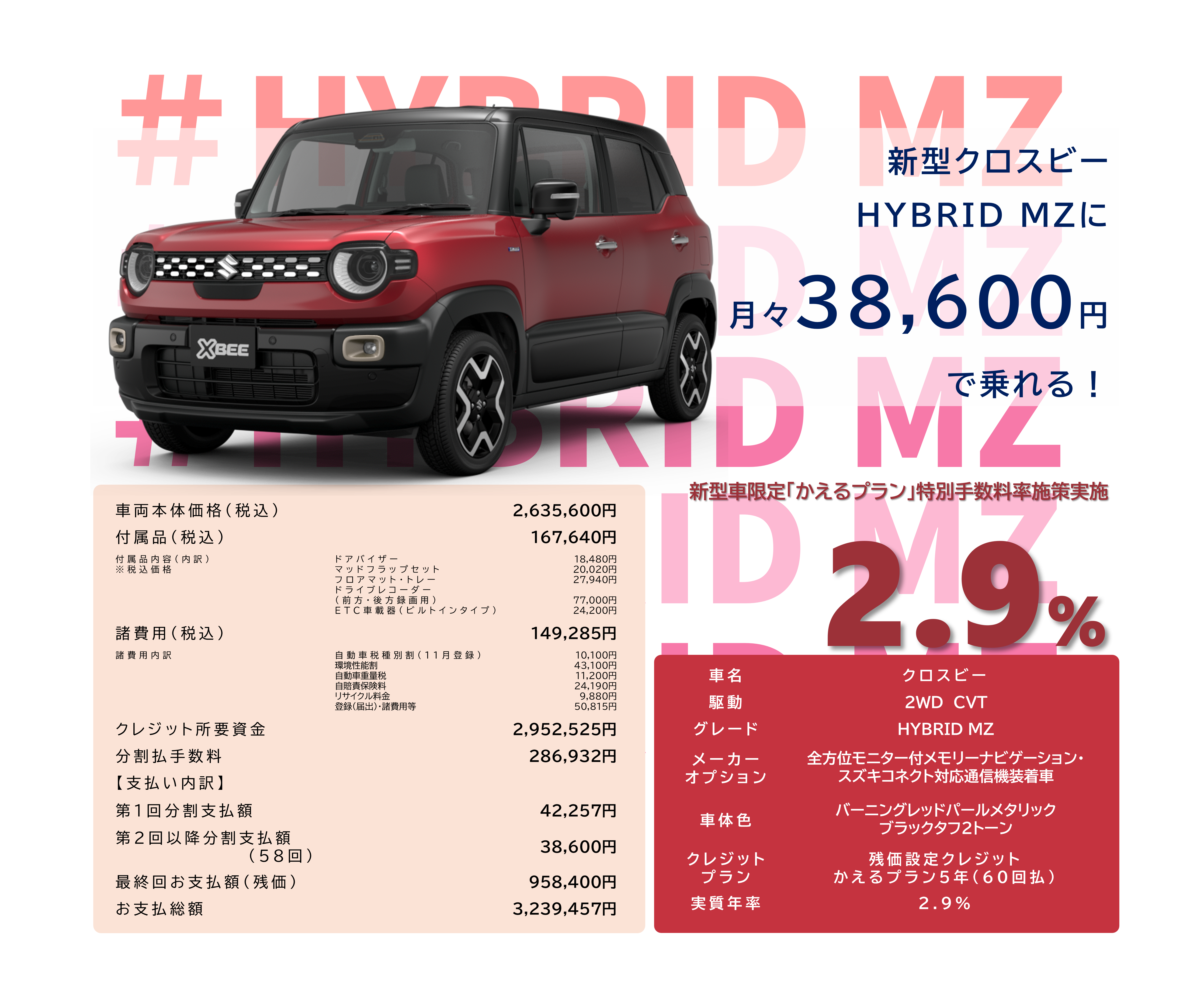 スズキファイナンスでは、新型クロスビーを多くのお客様に乗っていただきたく、「かえるプラン」特別手数料率を期間限定で実施しております。是非新型クロスビーをかえるプランでご検討いただきますようお願いいたします。